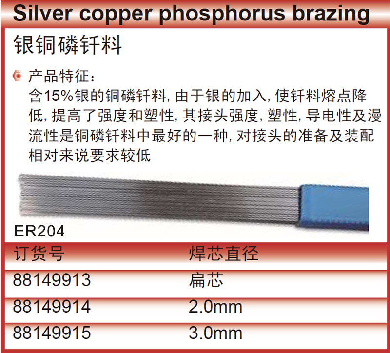 ·含15%银的铜磷钎料,由于银的加入,使钎料熔点降低,提高了强度和塑性,其接头强度,塑性,导电性及漫流性是铜磷钎料中好的一种,对接头的准备及装配相对来说要求较低