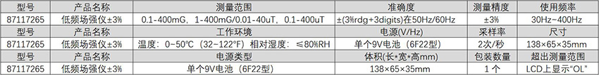A39472 87117265 0.1-400mG,1-400mG/0.01-40uT,0.1-400uT ±(3%rdg+3digits)在50Hz/60Hz ±3% 30Hz~400Hz LCD上显示“OL” 2次/秒 单个9V电池(6F22型) 单个9V电池(6F22型) 138×65×35mm 138×65×35mm 1 个 温度:0~50℃(32~122°F) 相对湿度:≤80%RH 1235.00