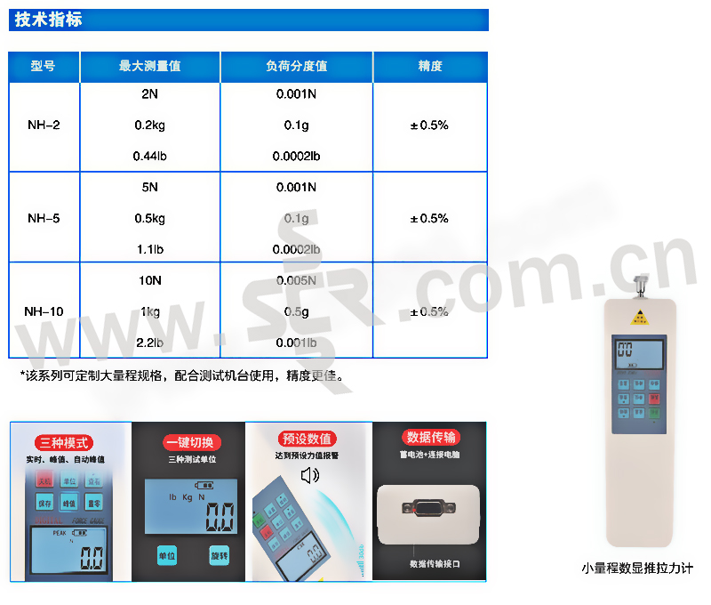 ·高精度的数显测力计可以测量拉力、推力等·4位数字液晶显示,可任选Kgf、N、lbf三种测量单位·读数方向可改变,可测量峰值·电池电量指示,充电过程符号指示·可存储100个数据·数据统计、平均值计算·可设置上、下限报警值·USB接口,可配电脑、打印机(选配件)·内置可充电镍氢电池·省电功能,无操作自动关机。