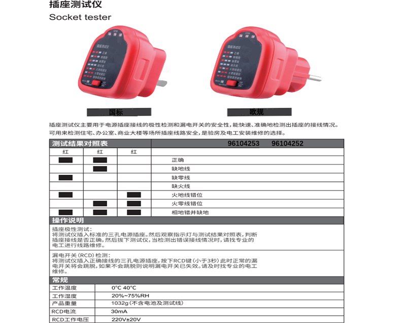 ·插座极性测试: 将测试仪插入标准的三孔电源插座.然后观察指示灯与测试结果对照表,判断插座接线是否正确,然后拔下测试仪,当检测出错误接线情况时,请找专业的电工进行线路维修。 漏电开关(RCD)检测: 将测试仪插入正确接线的三孔电源插座,按下RCD键(小于3秒)此时正常的漏电开关将会跳脱,如果不会跳脱则说明漏电开关已失效。请及时找专业的电工维修。