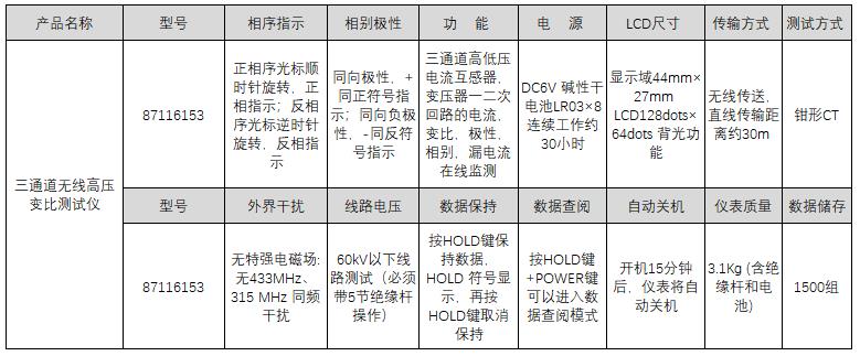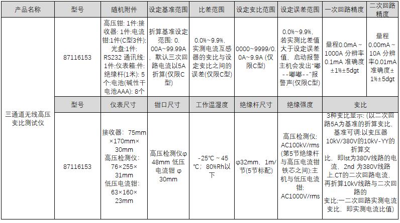 A35491 87116153 DC6V 碱性干电池LR03×8连续工作约30小时 钳形CT 无线传送,直线传输距离约30m 显示域44mm×27mm LCD128dots×64dots 背光功能 接收器:75mm×170mm×30mm 高压检测仪:76×255×31mm 低压电流钳:63×160×23mm 高压检测仪φ48mm 低压电流钳 φ30mm 量程0.0mA~1000A 分辨率0.1mA 准确度±1%±5dgt 量程0.00mA~10A 分辨率0.01mA 准确度±1%±5dgt 折算基准设定范围: 0. 00A~99.99A,默认三次回路电流以5A折算(仅限C型) 0000~9999/0.0A~9.9A (仅限C型) 26800.00