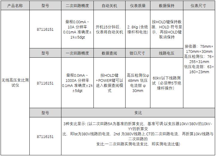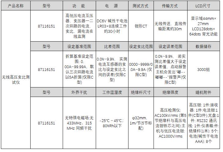 A35489 87116151 DC6V 碱性干电池LR03×8连续工作约30小时 钳形CT 无线传送,直线传输距离约30m 显示域44mm×27mm LCD128dots×64dots 背光功能 接收器:75mm×170mm×30mm 高压检测仪:76×255×31mm 低压电流钳:63×160×23mm 高压检测仪φ48mm 低压电流钳 φ30mm 量程0.0mA~1000A 分辨率0.1mA 准确度±1%±5dgt 量程0.00mA~10A 分辨率0.01mA 准确度±1%±5dgt 3种变比显示: (以二次回路5A为基准的折算变比,基准可调:以变压器10kV/380V的10kV-YY的折算交 比,即lst为380V线路的电流,2nd 为380V线路上.CT的二次回路电流,再折算10kV线路与二次回路的 变比;一二次回路实测电流变比,即实测电流比值) 折算基准设定范围: 0. 00A~99.99A,默认三次回路电流以5A折算(仅限C型) 15600.00