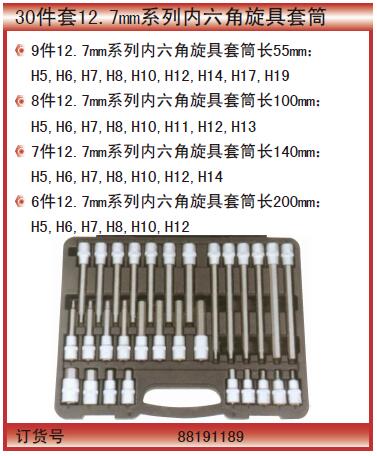 A15642 88191189 30 1 9件12.7mm系列内六角旋具套筒长55mm: H5,H6,H7,H8,H10,H12,H14,H17,H19 8件12.7mm系列内六角旋具套筒长100mm: H5,H6,H7,H8,H10,H11,H12,H13 7件12.7mm系列内六角旋具套筒长140mm: H5,H6,H7,H8,H10,H12,H14 6件12.7mm系列内六角旋具套筒长200mm: H5,H6,H7,H8,H10,H12 1472.90