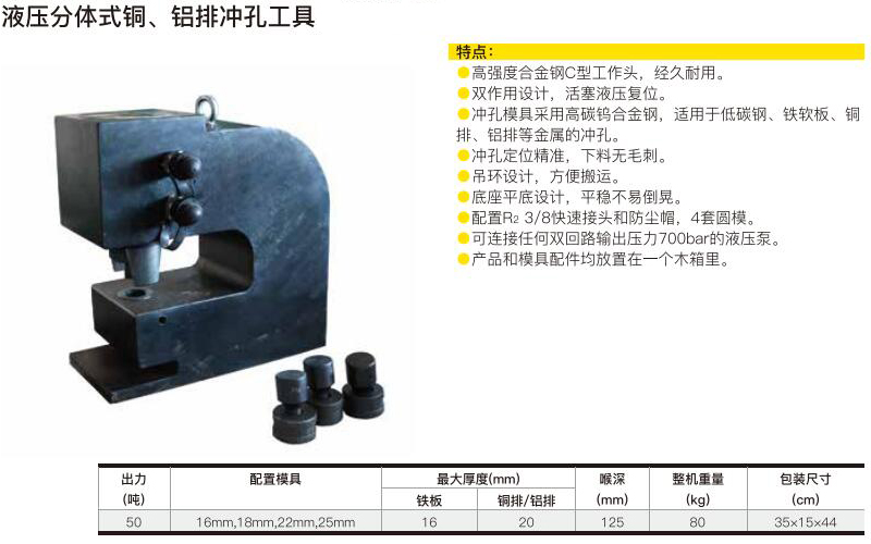 ·高强度合金钢c型工作头,经久耐用。 ·双作用设计,活塞液压复位。 ·冲孔模具采用高碳钨合金钢,适用于低碳钢、铁软板、铜排、铝排等金属的冲孔。 ·冲孔定位精准,下料无毛刺。吊环设计,方便搬运。 ·底座平底设计,平稳不易倒晃。 ·可连接任何双回路输出压力700bar的液压泵。 ·产品和模具配件均放置在一个木箱里。