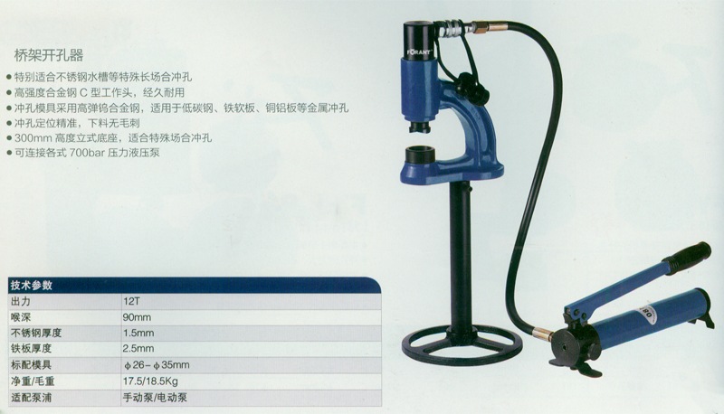 ·特别适合不锈钢水槽等特殊长场合冲孔·高强度合金钢C型工作头,经久耐用 ·冲孔模具采用高弹钨合金钢,适用于低碳钢、铁软板、铜铝板等金属冲孔 ·冲孔定位精准,下料无毛刺 ·300mm高度立式底座,适合特殊场合冲孔 ·可连接各式700bar 压力液压泵