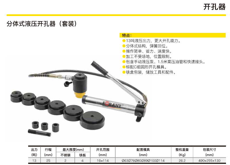 ·13吨液压出力,更大开孔能力。 ·分体式结构,弹簧回位。 ·操作简单、省力、速度快。 ·加工不受场地,位置限制。 ·包含手动液压泵、 1·5米高压油管 和快速接头。 ·标配C组圆形开孔模具。 ·铁盒包装,储放工具和配件。