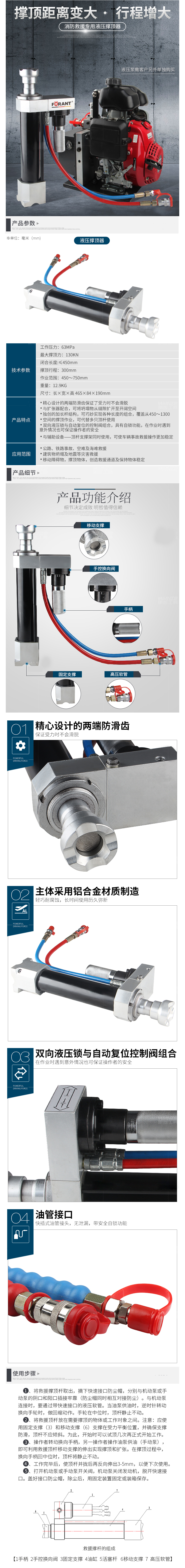 ·精心设计的两端防滑齿保证了受力时不会滑脱 ·与扩张器配合,可将坍塌物从缝隙扩开至开阔空间 ·独创的加长杆结构,可巧妙实现各种长度的组合 ·覆盖从450-1300空间的撑顶作业,可代替多只顶杆使用 ·双向液压锁与自动复位的控制阀组合,具有自锁功能 ·与辅助设备-顶杆支撑架同时使用,可使车辆事故救援操作更加稳定