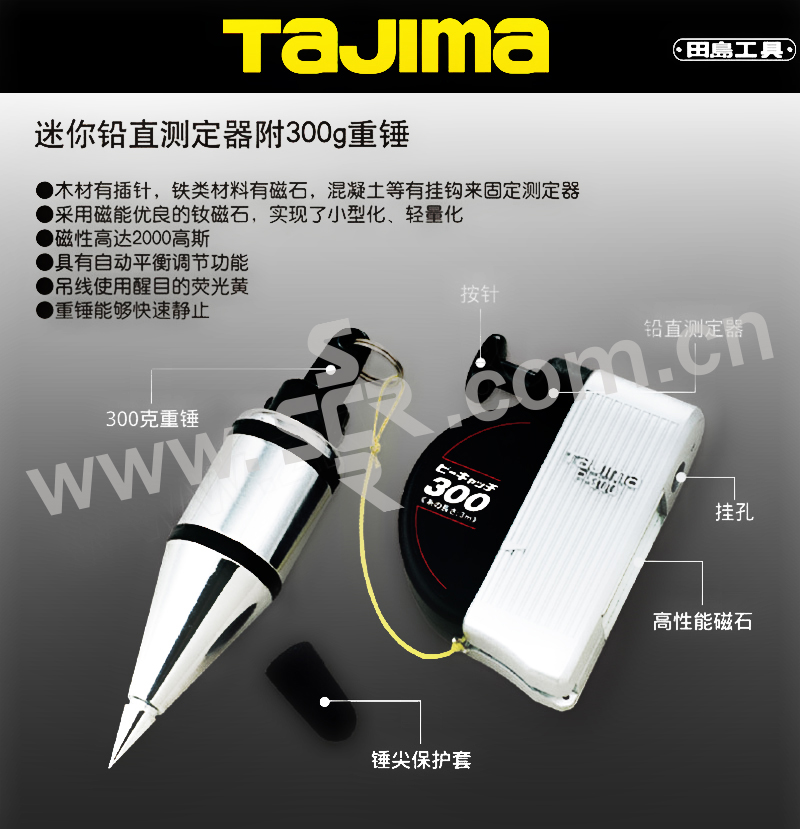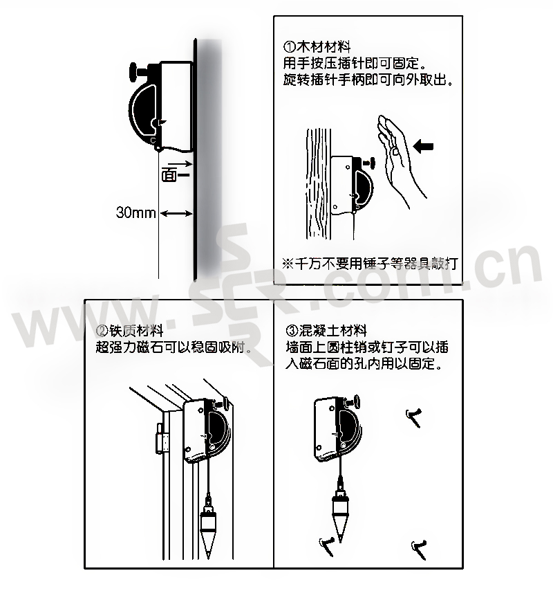·木材表面使用针,钢铁表面使用强力磁石固定。其他铝合金门窗,混凝土等也可以一键固定 ·附有吸着力强的磁石,体积小,轻便 ·插针可以直接插入木材中,旋转插针手柄即可顺利拔出 ·100g-400g的重锤均可使用,并附带无需调节平衡的自动调节平衡装置 ·附带可在混凝土材料上安装的圆柱销子及钉子 ·根据现场需要,有2个位置(面一、30mm)可用来设定挂线和固定面的距离) ·附带挂绳线粗:0.9mm(1010-2429)