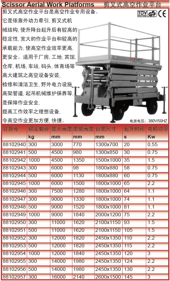 ·它是依靠外动力牵引,剪叉式机械结构,使升降台起升后有较高的稳定性,宽大的作业平台和较高的承载能力,使高空作业效率更高,更安全。