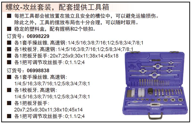 D23684 06998229 各1套手操丝锥,高速钢:1/4;5/16;3/8;7/16;1/2;5/8;3/4;7/8;1 各1枚板牙,高速钢:1/4;5/16;3/8;7/16;1/2;5/8;3/4;7/8;1 各1把板牙扳手:20x7;25x9;30x11;38x14;45x18 各1把可调节攻丝扳手:0;1.1/2;4 8740.58