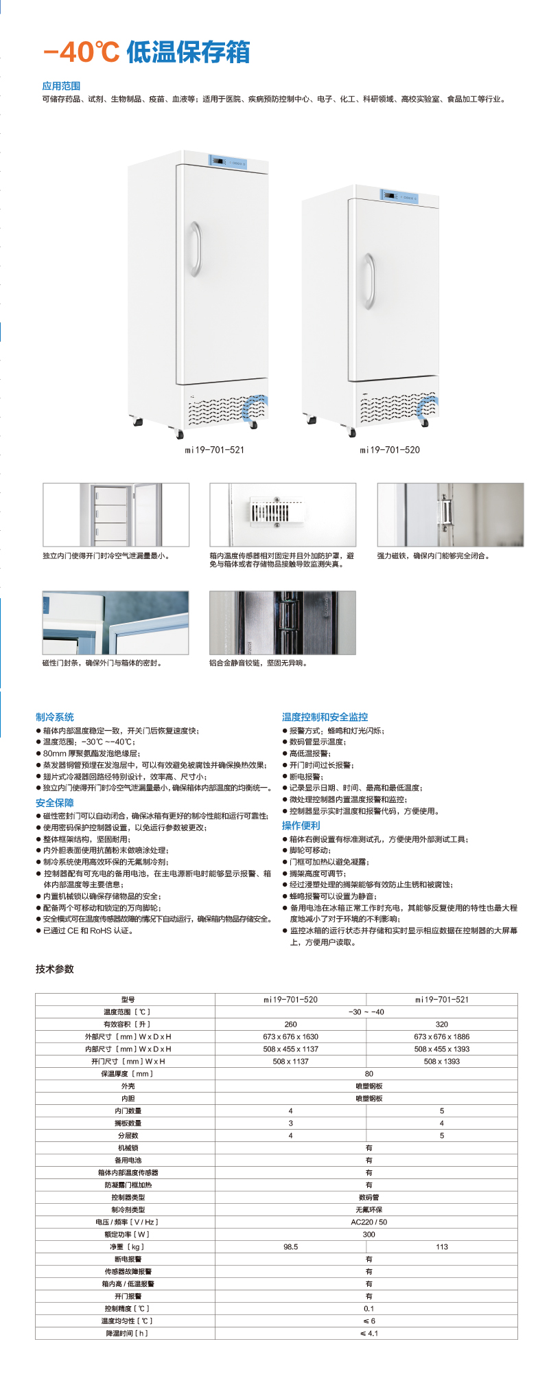 箱体内部温度稳定一致,开关门后恢复速度快;温度范围:-30℃ ~-40℃;