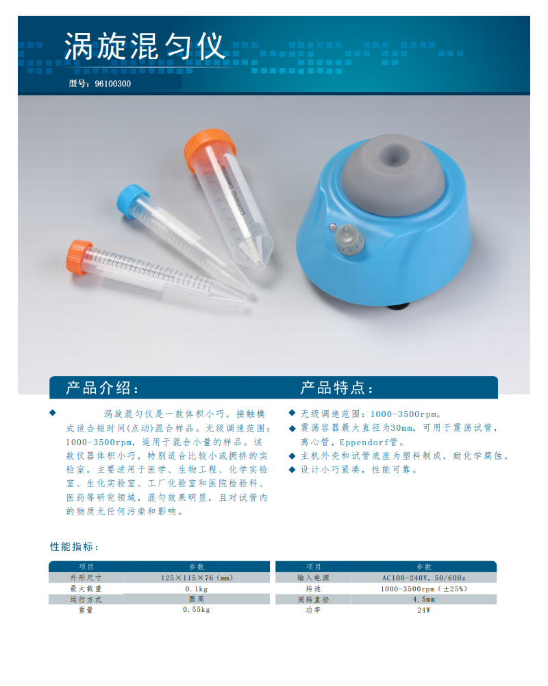 ·无级调速范围:1000-3500rpm ·振荡容器最大直径为30mm,可用于振荡试管,离心管,Eppendorf管。 ·主机外壳和试管底座为塑料制成,耐化学腐蚀。 ·设计小巧紧凑,性能可靠。