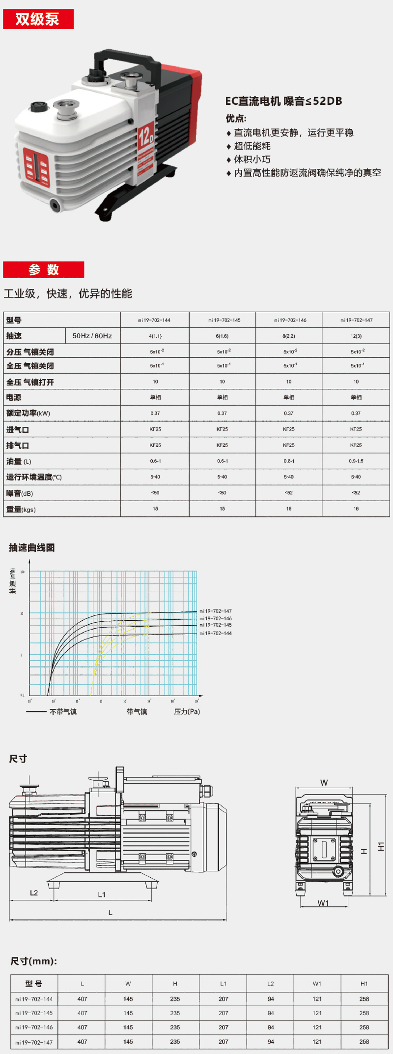 ·优秀的性能整体式缺体结构,具有更高的精度,经验证的旋片技术,使性能更加稳定,确保系统具有更高的可靠性 ·良好的散热风冷结构,无需外接水冷箱,减少系统安装和维护成本 ·强制润滑内置齿轮泵及恒压供油机构强制供油,高吸气压强下也能稳定可靠运行 ·多档气镇设计满足不同客户的真空度要求和水蒸气的处理能力