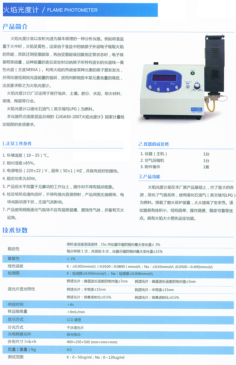 ·火焰光度计是以发射光谱为基本原理的一种分析仪器 ·包括气体和火焰燃烧部分,光学部分,光电转换器及检测记录部分 ·利用火焰的热能使某元素的原子激发发光,并用仪器检测其光谱能量的强弱,进而判断物质中某元素含量的高低 ·LCD液晶屏显示,直观清晰 ·一键自动点火 ·带有火焰大小预先选定功能 ·熄火检测与自动切断燃气功能
