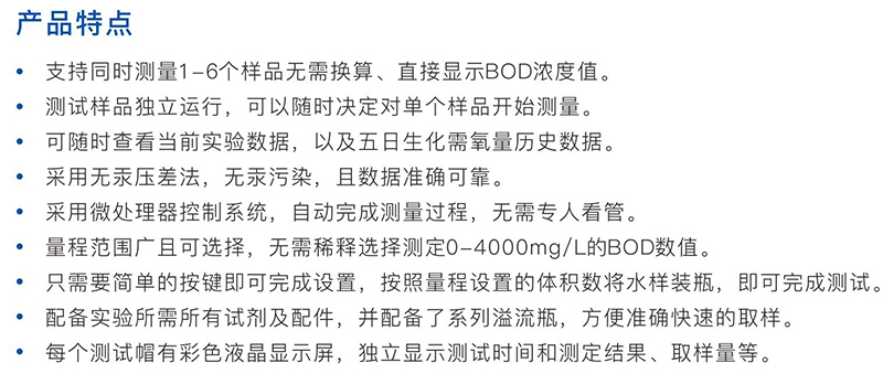 ·支持同时测量1-6个样品无需换算、直接显示BOD浓度值。测试样品独立运行,可以随时决定对单个样品开始测量。