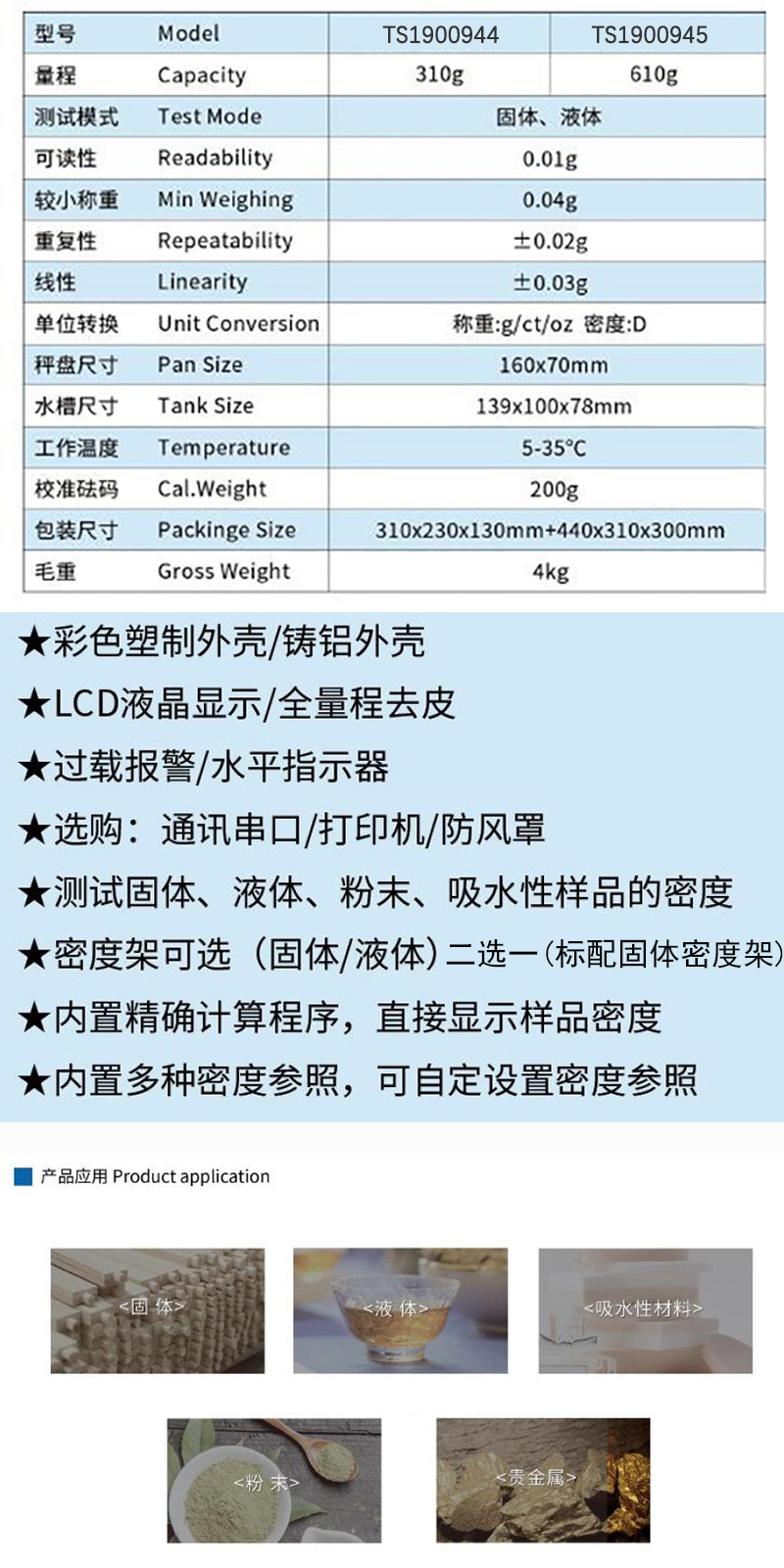 ·彩色塑制外壳/铸铝外壳 ·LCD液晶显示/全量程去皮 ·过载报警/水平指示器 ·选购:通讯串口/打印机/防风罩 ·测试固体、液体、粉末、吸水性样品的密度 ·密度架可选(固体/液体) ·内置精确计算程序,直接显示样品密度 ·内置多种密度参照,可自定设置密度参照