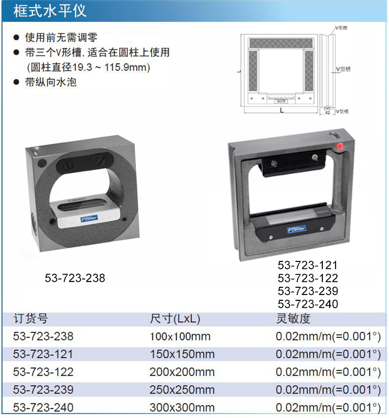 ·使用前无需调零 ·带三个V形槽,适合在圆柱上使用 圆柱直径19.3 ~ 115.9mm ·带纵向水泡