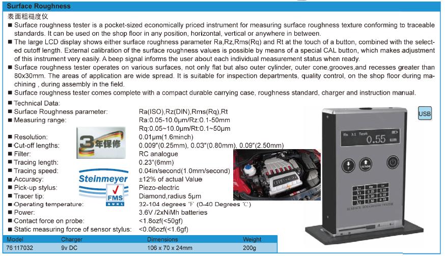 ·Surace粗糙度测试仪是一种经济实用的袖珍型仪器,用于测量符合可追溯性的表面粗糙度纹理标准。它可以在车间的任何位置(水平,垂直或介于两者之间的任何位置)使用。大型LCD显示屏在触摸按钮时会显示表面粗糙度参数Ra,RZ.Rms(Rq)和Rt,并与选择项结合在一起。截止长度通过特殊的CAL按钮可以对表面粗糙度值进行外部校准蜂鸣信号会在准备就绪时通知用户每个单独的测量状态。表面粗糙度测试仪可在各种表面上运行,不仅可以测量油脂,还可以测量外部圆柱体,外部圆锥体,沟槽以及大于80x30mm。适用范围广。在野外组
