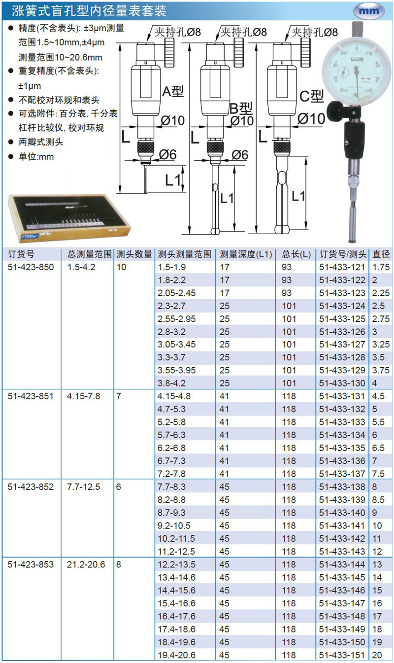 ·精度(不含表头): ±3μm测量 范围1.5~10mm,±4μm 测量范围10~20.6mm ·重复精度(不含表头): ±1μm ·不配校对环规和表头 ·可选附件:百分表,千分表 杠杆比较仪,校对环规 ·两瓣式测头 ·单位:mm