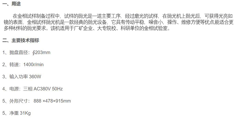 ·在金相试样制备过程中,试样的抛光是一道主要工序,经过磨光的试样,在抛光机上抛光后,可获得光亮如镜的表面,金相试样抛光机是一款经典的抛光设备,它具有传动平稳,噪音小,操作、维修方便等优点能适合更多种材料的抛光要求。该机适用于厂矿企业、大专院校、科研单位的金相试验室。