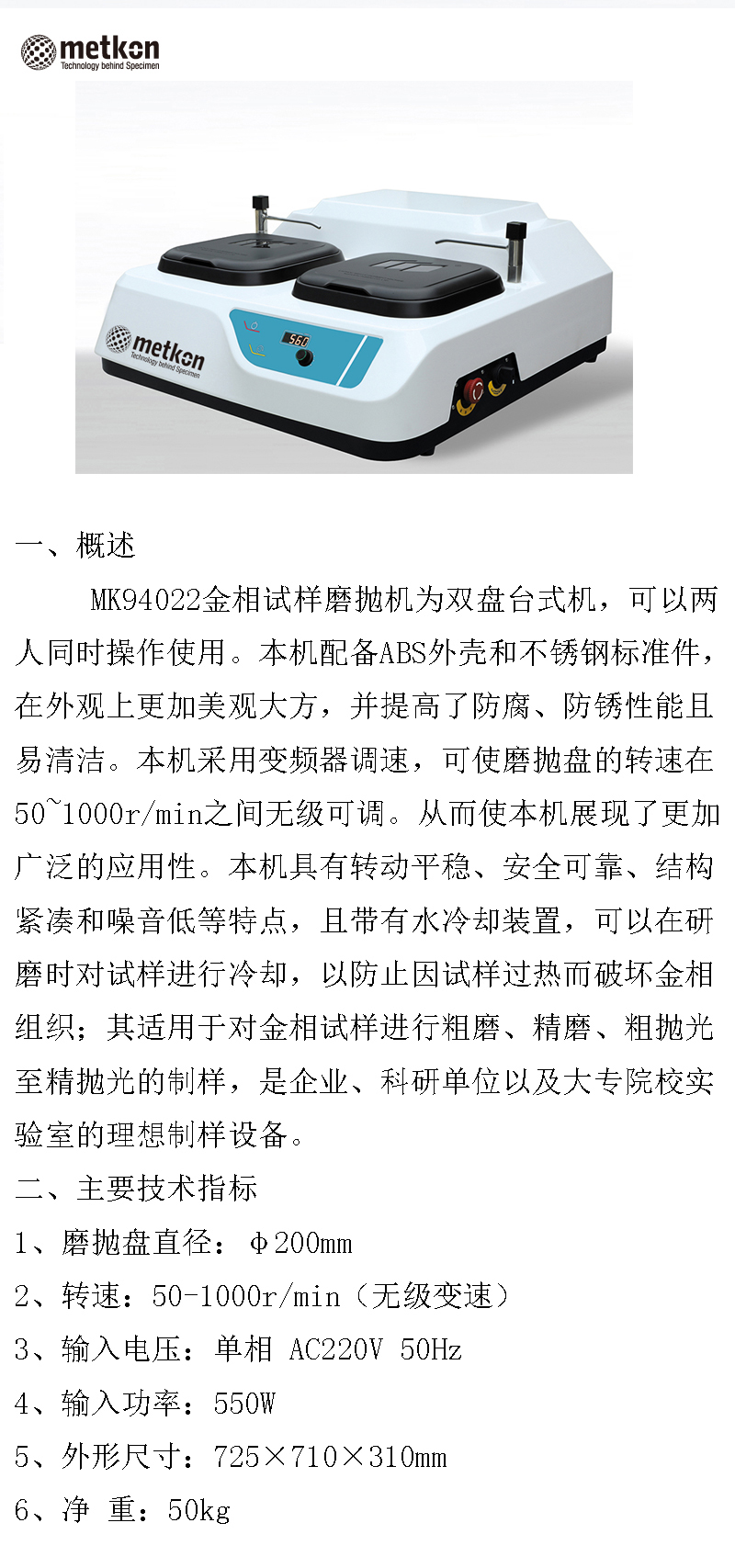 ·该型金相试样磨抛机为双盘台式机,具备磨抛盘旋转方向可任意选择。本机采用了先进的微处理器控制系统,更换金相砂纸和抛光织物可分别进行磨、抛工序的操作,从而使本机展现了更加广泛的应用性。本机具有转动平稳、安全可靠、结构紧凑和噪音低等特点;且带有水冷却装置,可·以在研磨时对试样进行冷却,以防止因试样过热而破坏金相组织,是企业、科研单位以及大专院校实验室的理想制样设备。