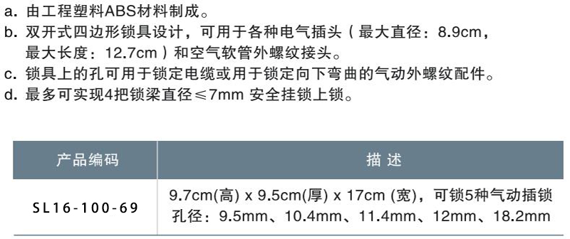 ·9.7cm(高) x 9.5cm(厚) x 17cm(宽)。可锁5种气动插锁孔径:9.5mm、10.4mm、11.4mm.12mm、18.2mm