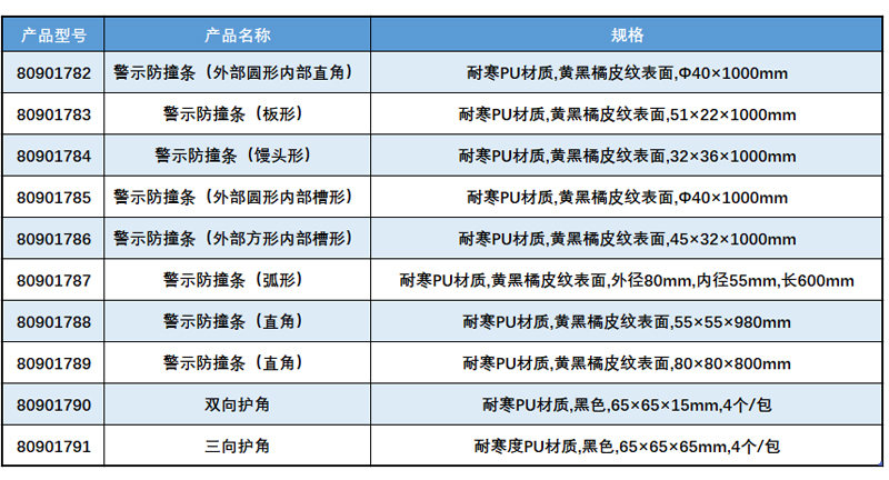 ·适用于货架、机器设备等突出部位的警示和保护; ·优质PU材质提供良好弹性,降低人员及设施和因碰撞导致的损伤; ·内附高性能背胶安装方便(D/E款除外);