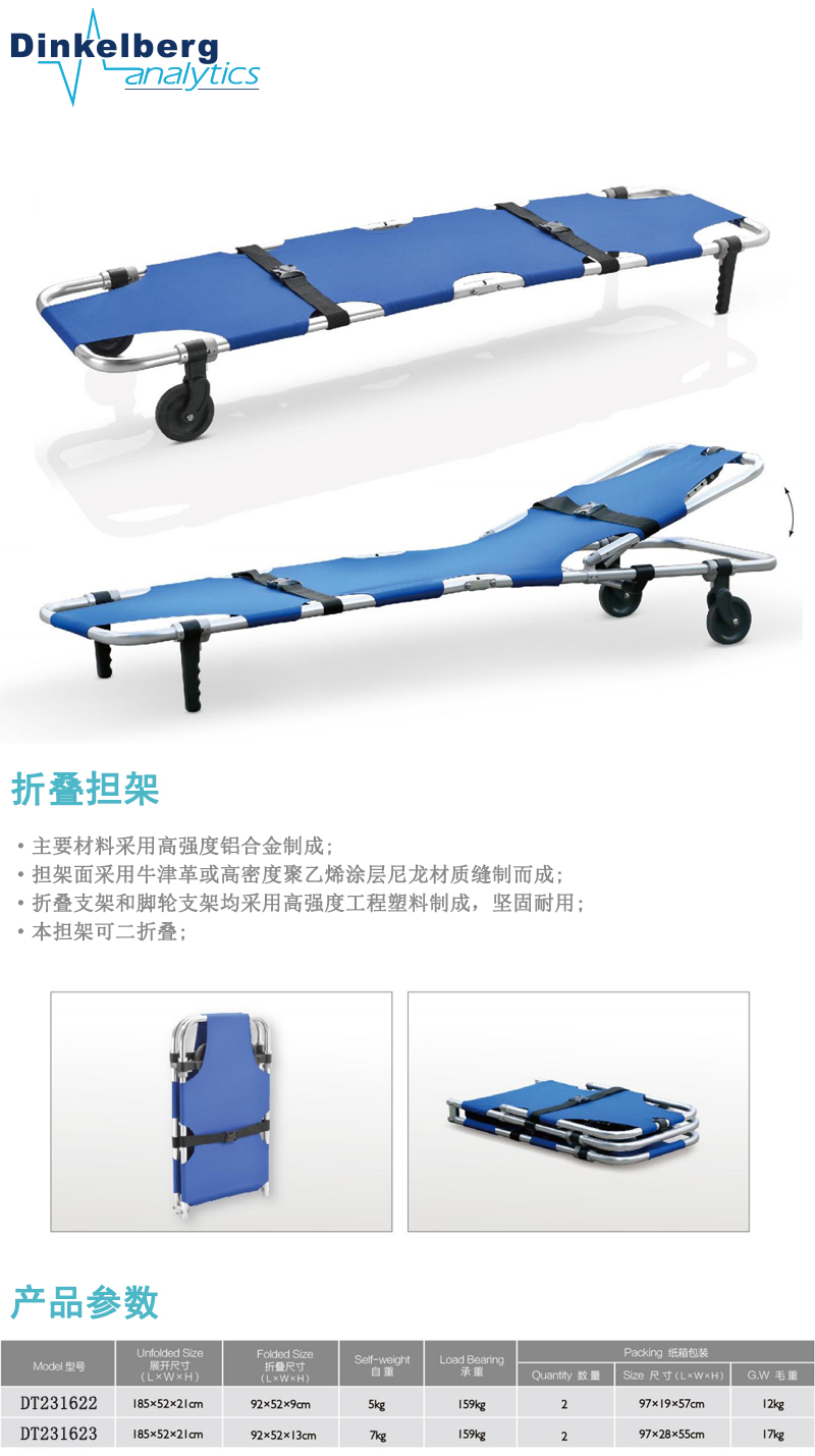 ·主要材料采用高强度铝合金制成 ·担架面采用牛津革或高密度聚乙烯涂层尼龙材质缝制而成 ·折叠支架和脚轮支架均采用高强度工程塑料