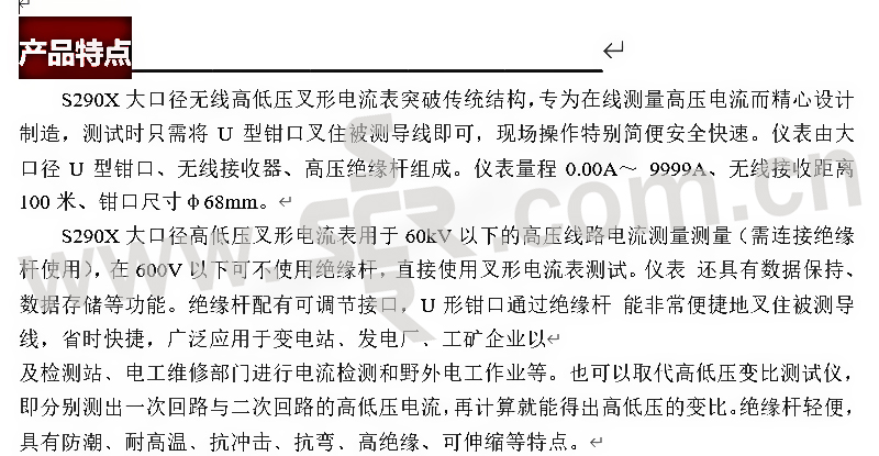 ·大口径无线高低压叉形电流表突破传统结构,专为在线测量高压电流而精心设计制造,测试时只需将U型钳口叉住被测导线即可,现场操作特别简便安全快速