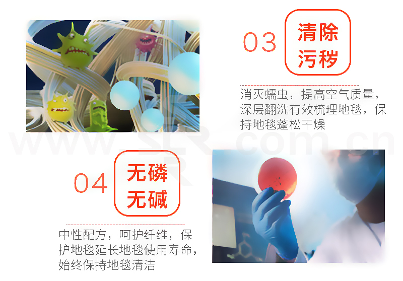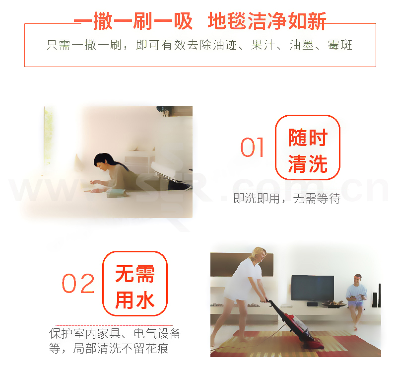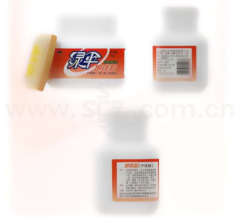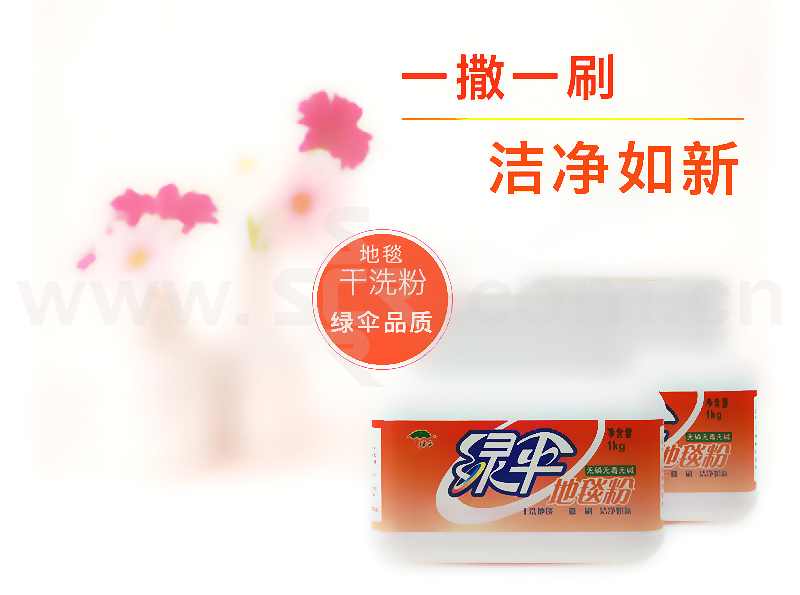 ·含高效渗透剂、去污剂和吸附剂优化组合,无磷无碱,中性配方,呵护纤维,保护地毯·迅速渗透,清除污垢,只需一撒一刷,即可有效去除油迹、果汁、油墨、霉斑、灰尘等污垢·消除螨虫,提高空气质量,保证地毯天天干净,不留花纹水印