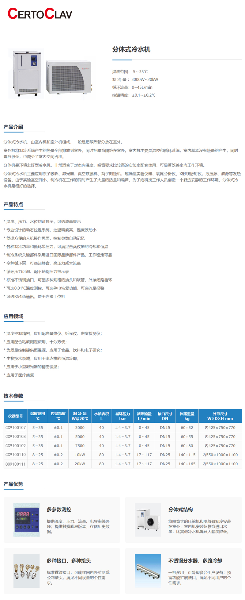 ·由室内机和室外机组成,一般是把散热部分放在室外; ·室外机将制冷系统产生的热量全部排放到室外,同时把噪音隔绝在室外; ·室内机主要是温控和循环系统,室内基本没有热量产生,同时噪音很低,也减少了室内空间占用; ·分体机是环境友好型冷水机,非常适合于对室内温度、噪音要求比较高的实验室配套使用,可显著改善室内工作环境。