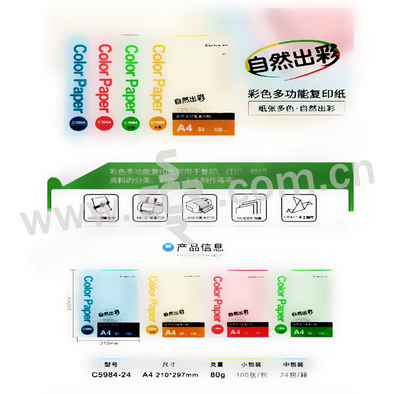 ·彩色复印纸具有很多颜色,大多是以色系为分类,浅色系包括绿色、蓝色、黄色、粉红色、浅灰色、浅紫色等