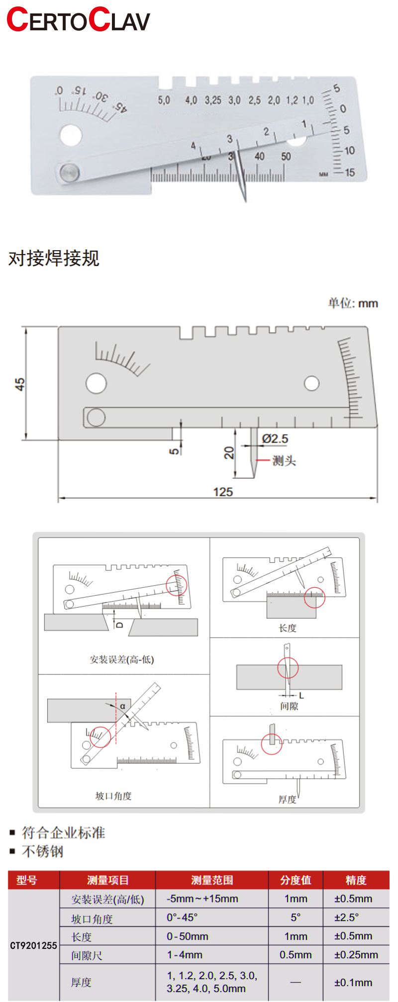 安装误差:-5mm~+15mm 坡口角度:0°~15° 长度:0~50mm 间隙尺:1~4mm 厚度:1mm,1.2mm,2.0mm,2.5mm,3.0mm,3.25mm,4.0mm,5.0mm