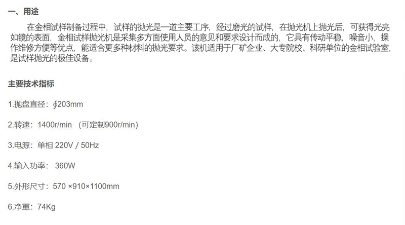 ·在金相试样制备过程中,试样的抛光是一道主要工序,经过磨光的试样,在抛光机上抛光后,可获得光亮如镜的表面,金相试样抛光机是采集多方面使用人员的意见和要求设计而成的,它具有传动平稳,噪音小,操作维修方便等优点,能适合更多种材料的抛光要求。该机适用于厂矿企业、大专院校、科研单位的金相试验室,是试样抛光的极佳设备。