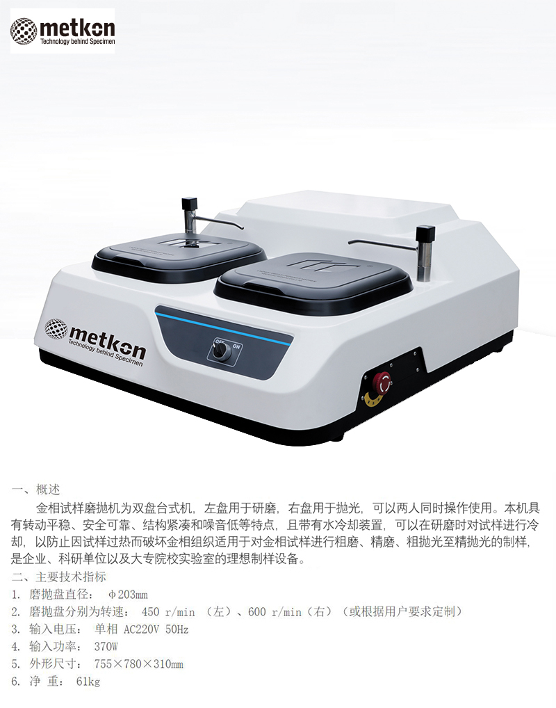 ·金相试样磨抛机为双盘台式机,左盘用于研磨,右盘用于抛光,可以两人同时操作使用。本机具有转动平稳、安全可靠、结构紧凑和噪音低等特点,且带有水冷却装置,可以在研磨时对试样进行冷却,以防止因试样过热而破坏金相组织适用于对金相试样进行粗磨、精磨、粗抛光至精抛光的制样,是企业、科研单位以及大专院校实验室的理想制样设备。