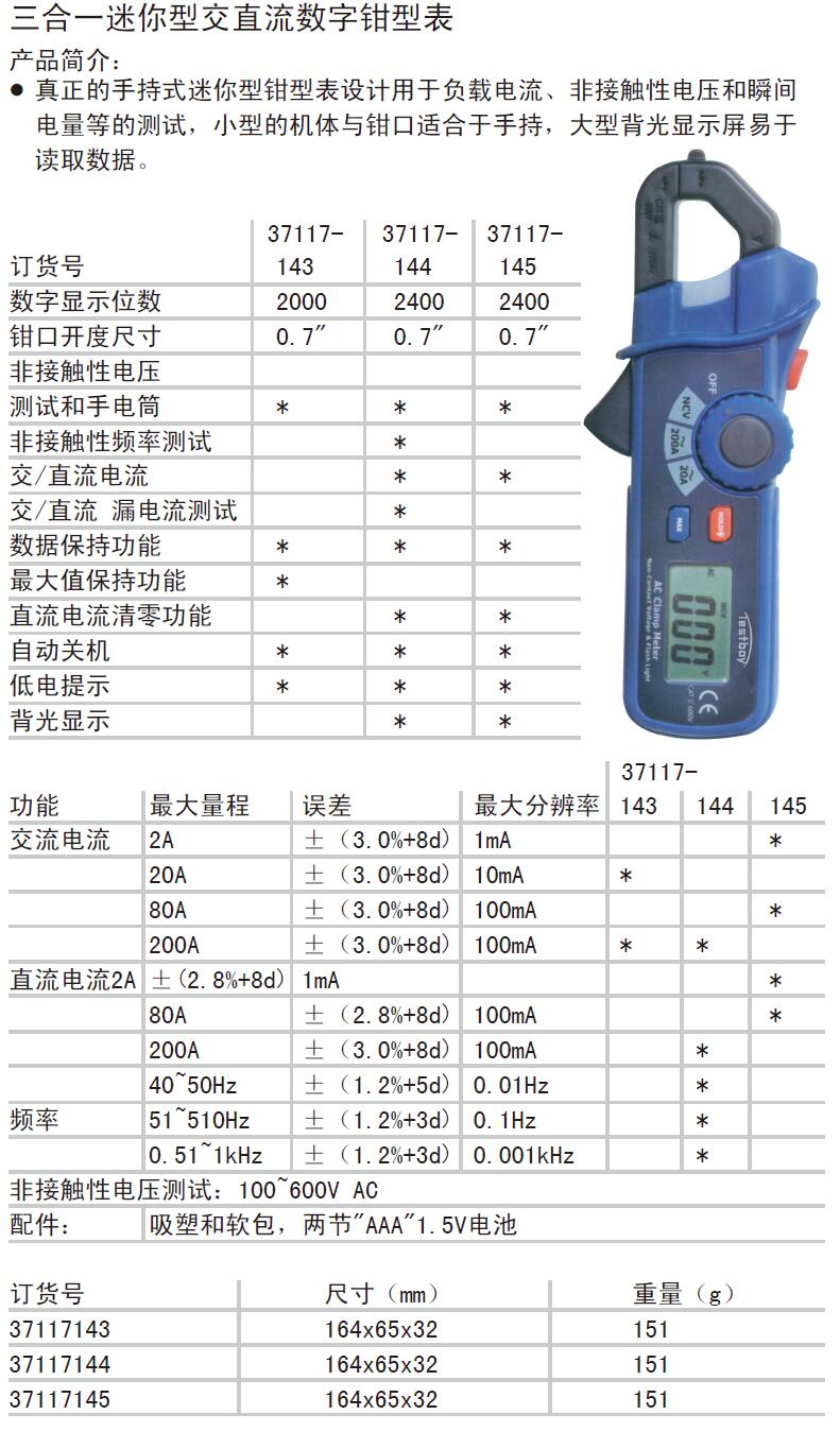 ·产品简介: · 真正的手持式迷你型钳型表设计用于负载电流、非接触性电压和瞬间 电量等的测试,小型的机体与钳口适合于手持,大型背光显示屏易于读取数据。 ·配件:吸塑和软包,两节"AAA"1.5V电池