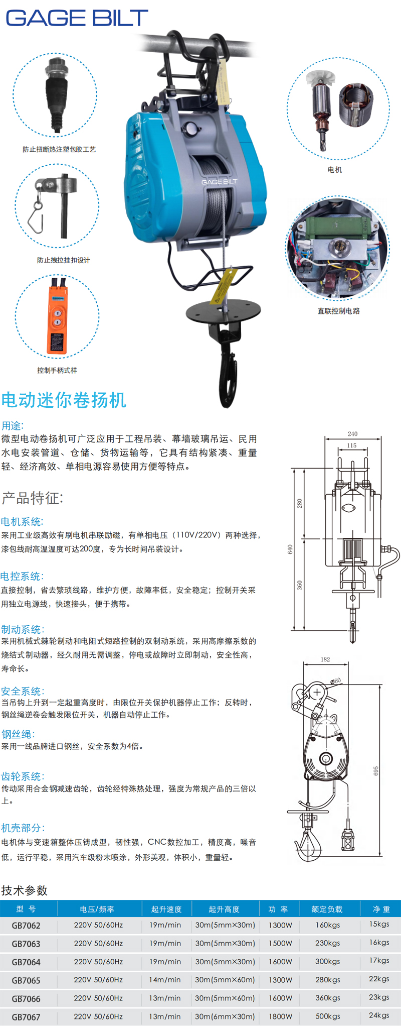 ·采用工业级高效有刷电机串联励磁,有单相电压(110V/220V)两种选择, ·漆包线耐高温温度可达201度,专为长时间吊装设计。